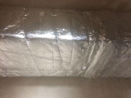Вид огнезащитного покрытия ОБМ-ТехВент закрепленного на воздуховоде с помощью сетки манье.